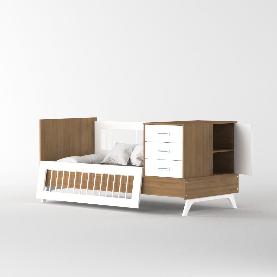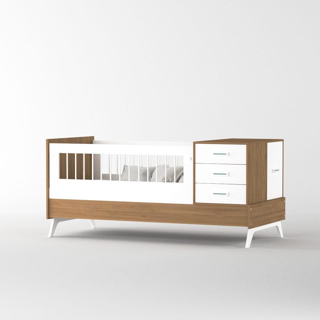 Funcional para colchón de 140 x 80 cm, convertible a cama de 190 x 80 cm. Acompaña el crecimiento del niño pudiendo quitarse una baranda cuando el niño ya no la necesite y luego quitando el botinero y cajonera, convirtiéndose en cama de una plaza dónde surgen 2 muebles auxiliares para la habitación.
